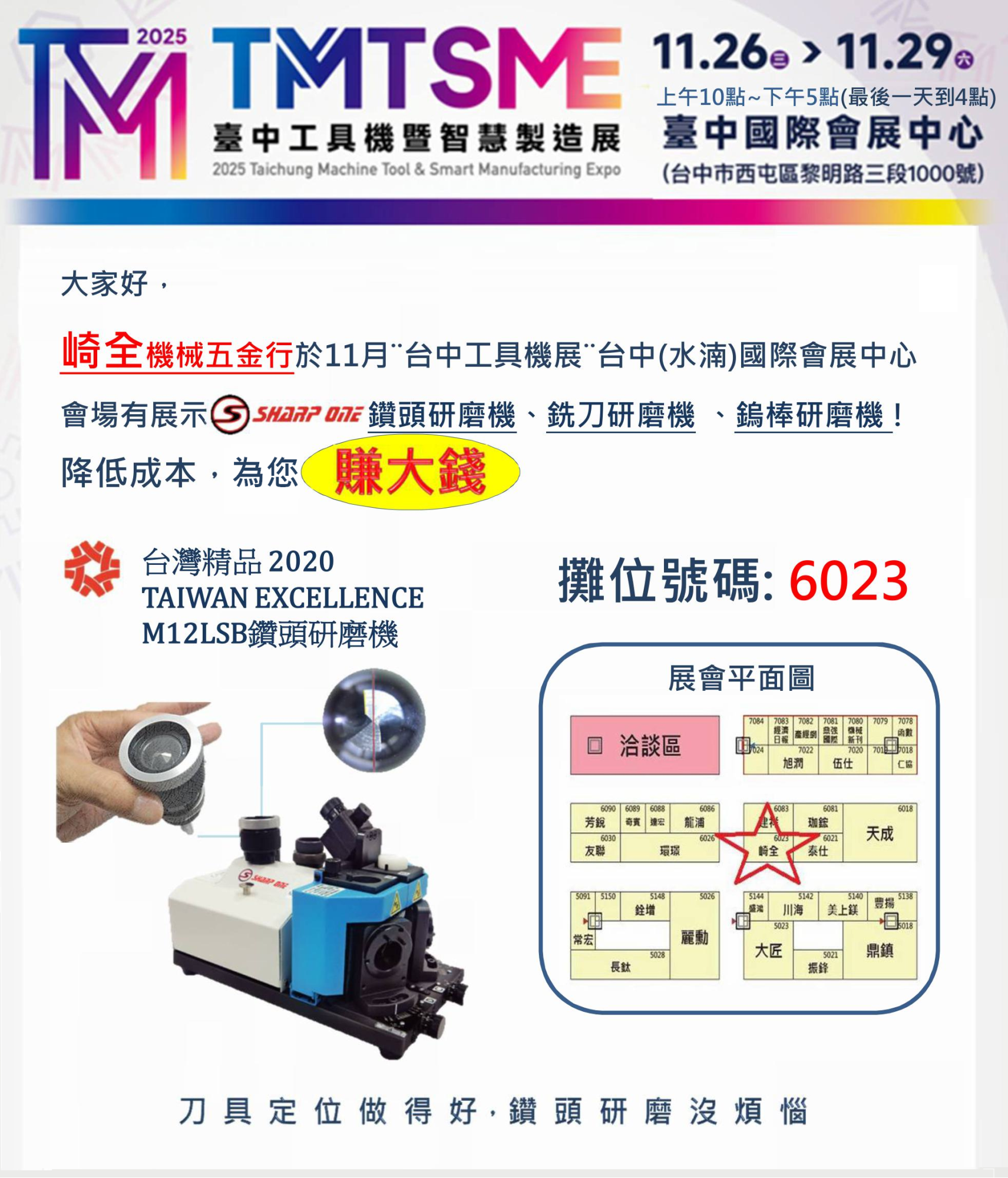 崎全機械五金行於11月¨台中工具機暨智慧製造展¨有展示Sharp One鑽頭研磨機機、銑刀研磨機 、鎢棒研磨機 !